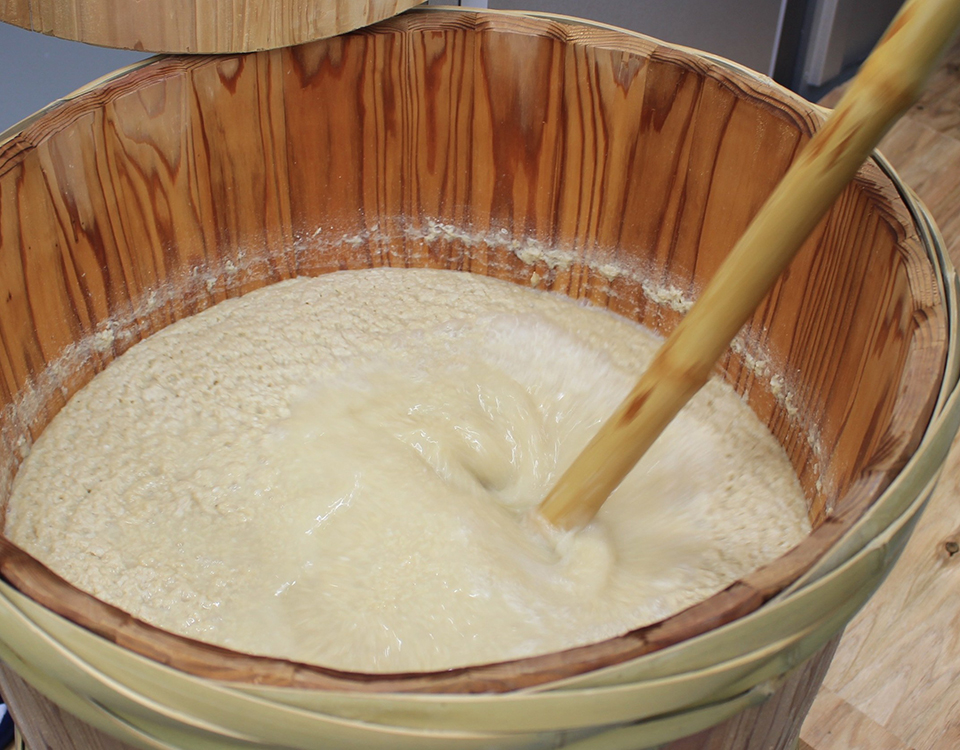 酒蔵の1階にある仕込み室に入ると、製造責任者の南雲歩さんがもろみの入った木桶を冷蔵庫から出してくれた。この木桶が仕込みタンクなのだ。