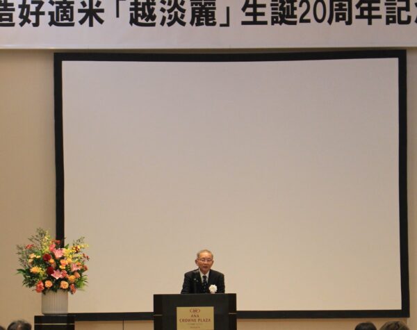 この日、酒造好適米「越淡麗」の生誕20周年記念式典が催され、新潟県、県醸造試験場、酒米プロジェクトチーム、生産者、JA、酒造会社、主催者である県酒造組合の原料米対策委員会や越淡麗栽培研究会事務局ら、越淡麗の開発からこれまでの歩みに関わった80名を超える人たちが集った。