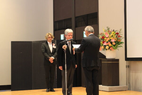 表彰を受ける渡辺さん(中央)と板垣さん(左)