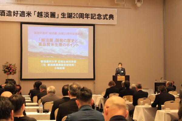 式典では新潟薬科大学応用生命科学部教授の小林和幸さんが「越淡麗の開発の歴史と高品質生産のポイント」の演題で基調講演を行った。