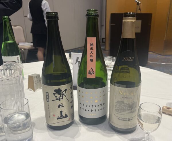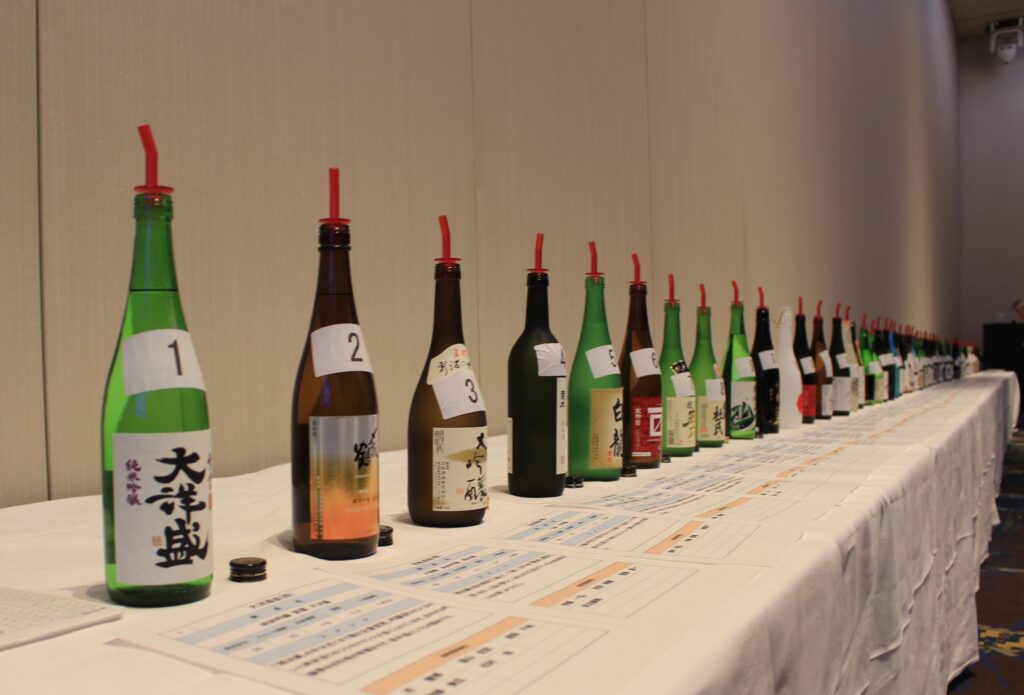 新潟市中央区のANAクラウンプラザホテルの懇親会会場に並んだ59本の新潟清酒。
