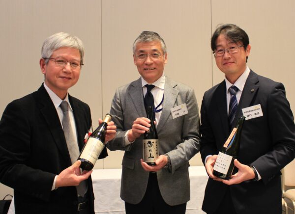 渡辺さん(左)と県農業総合研究所作物研究センター長の樋口泰浩さん(右)、県酒造組合副会長の平田大さん(中央)