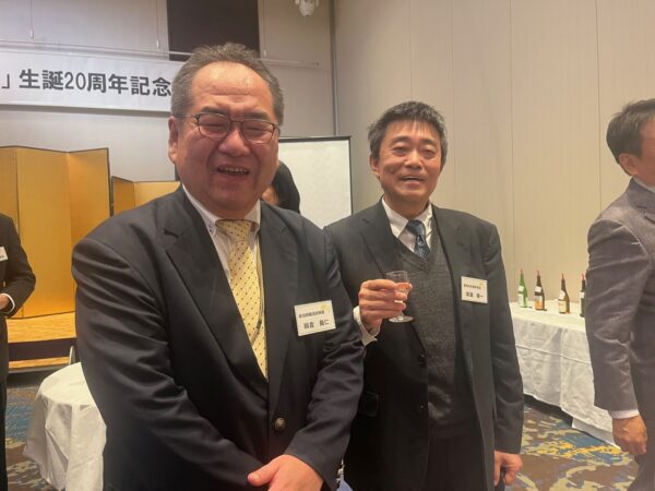 懇親会での板垣さん(左)と県酒造組合坂井専務(右)
